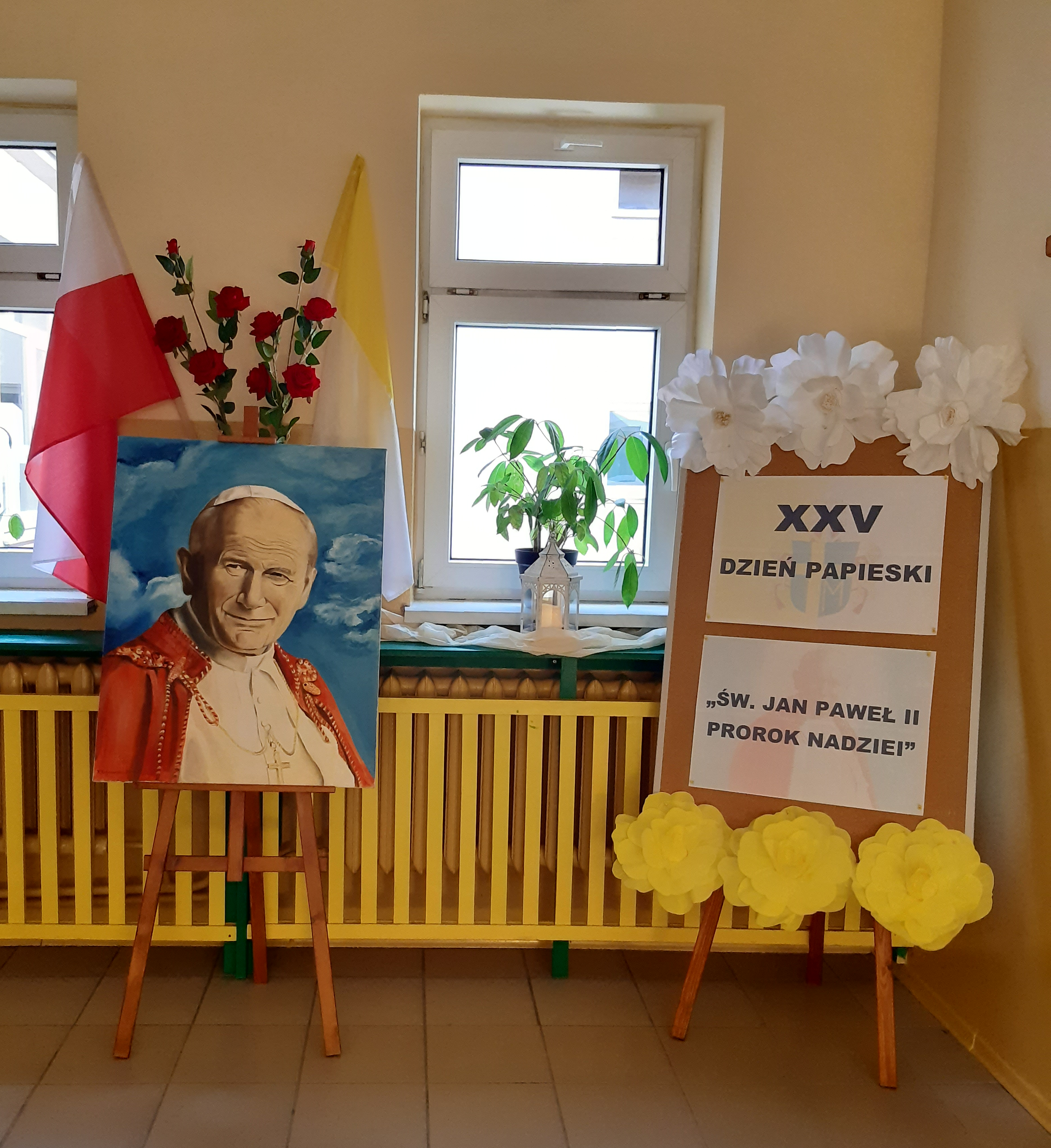 W naszej szkole pamiętamy o Wielkim Polaku, Świętym Papieżu - Janie Pawle II. To dla niego kolejna pamiątkowa ekspozycja - dziękujemy Ojcze Święty. Nauczyciele i Uczniowie PZS w Suskowoli.
