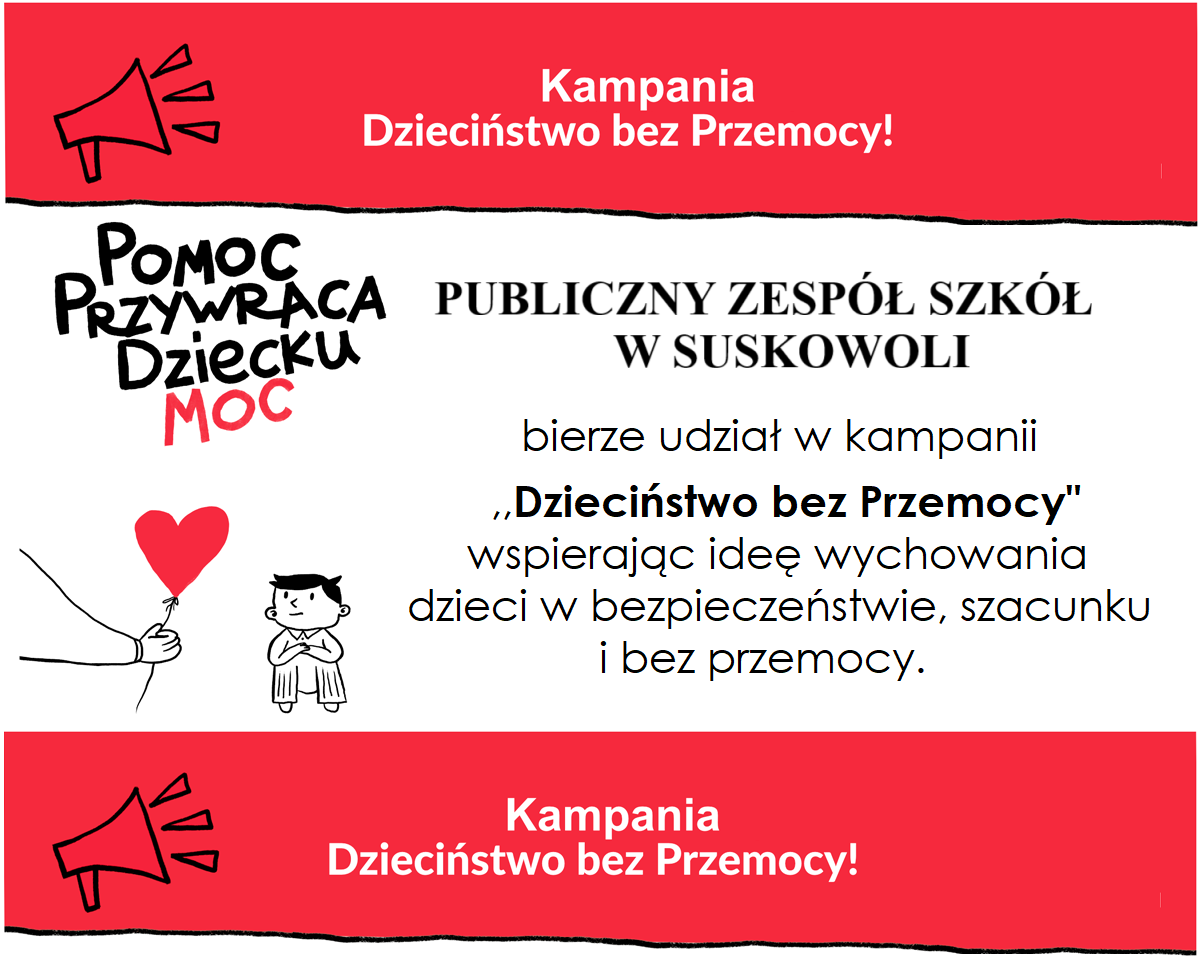 Publiczny Zespół Szkół w Suskowoli aktywnie włącza się w ogólnopolską kampanię „Dzieciństwo bez Przemocy”. Jej głównym celem jest uświadamianie, że każde dziecko ma prawo do bezpiecznego dorastania, wolnego od przemocy fizycznej i psychicznej. Kampania promuje postawy oparte na szacunku, empatii, dialogu i wzajemnym wsparciu, a także wskazuje konstruktywne metody rozwiązywania konfliktów.