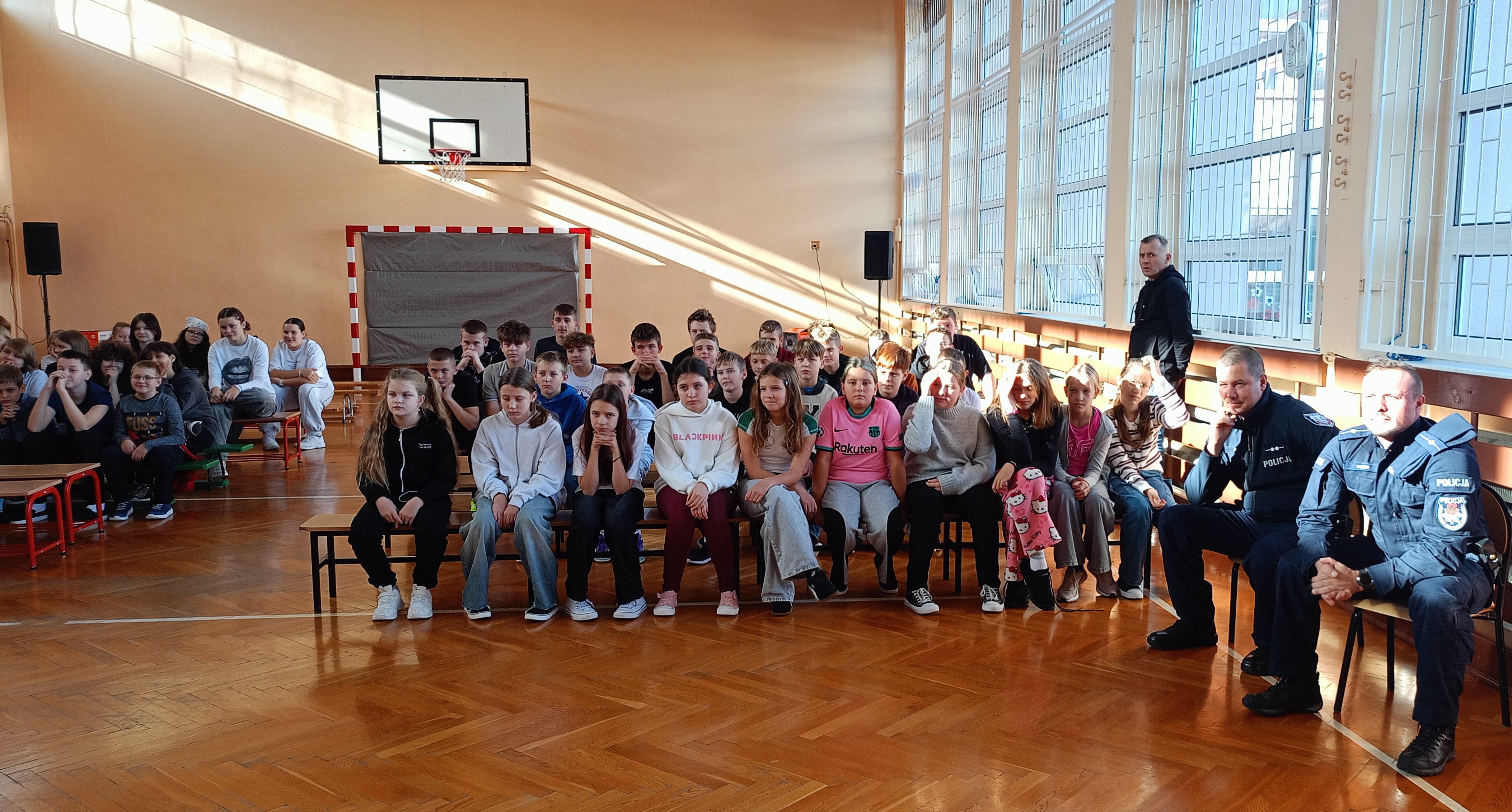 W ramach działań związanych z zapobieganiem przemocy rówieśniczej i zapewnianiem szeroko pojętego bezpieczeństwa, w dniu 05.11.2025 r w naszej szkole zostało zorganizowane spotkanie z policjantami KP w Pionkach panem mł.asp. Konradem Klimowiczem i asp. Grzegorzem Ociepą. Prelekcją zostali objęci uczniowie klas 4 – 8.