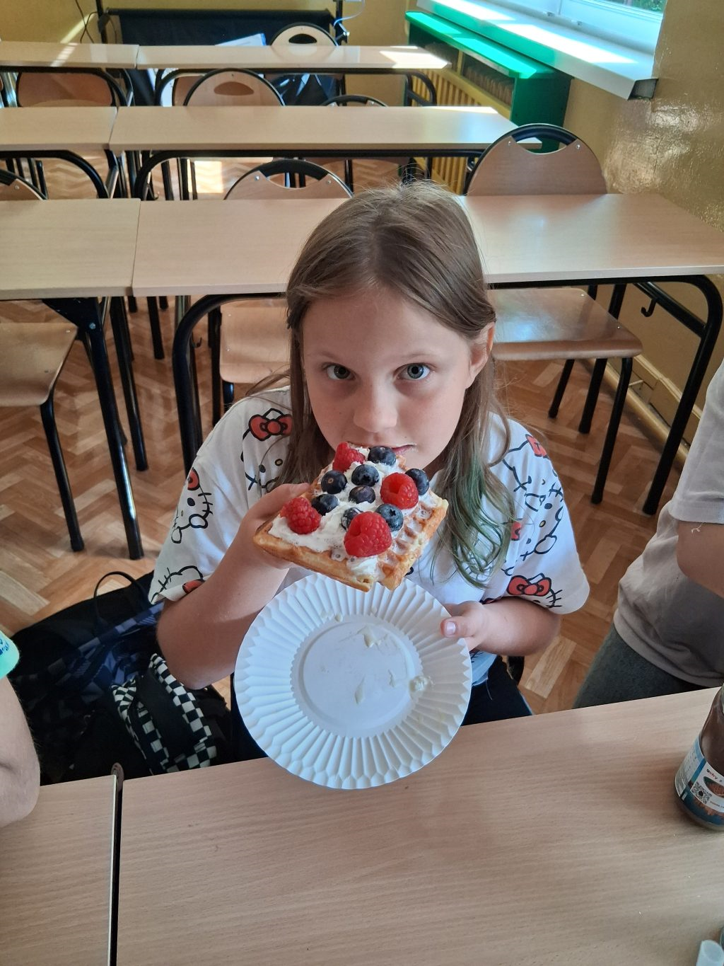 Na wrześniowych zajęciach koła techniczno - informatycznego wraz z uczniami klasy 4, korzystając z urządzeń AGD załupionych z programu Laboratoria Przyszłości, piekliśmy nasze ulubione gofry. Dziewczęta zajmowały się krojeniem i przygotowaniem dodatków, zaś chłopcy samym wypiekaniem ciasta. Kolejny raz zadowolone miny były dowodem, że gofry były smaczne i odpowiednio przystrojone kolorowymi owocami. Do naszych gofrów tradycyjnie nie dodajemy cukru, co powoduje, że nasze ciasto jest bardziej zdrowe a może też smaczniejsze.