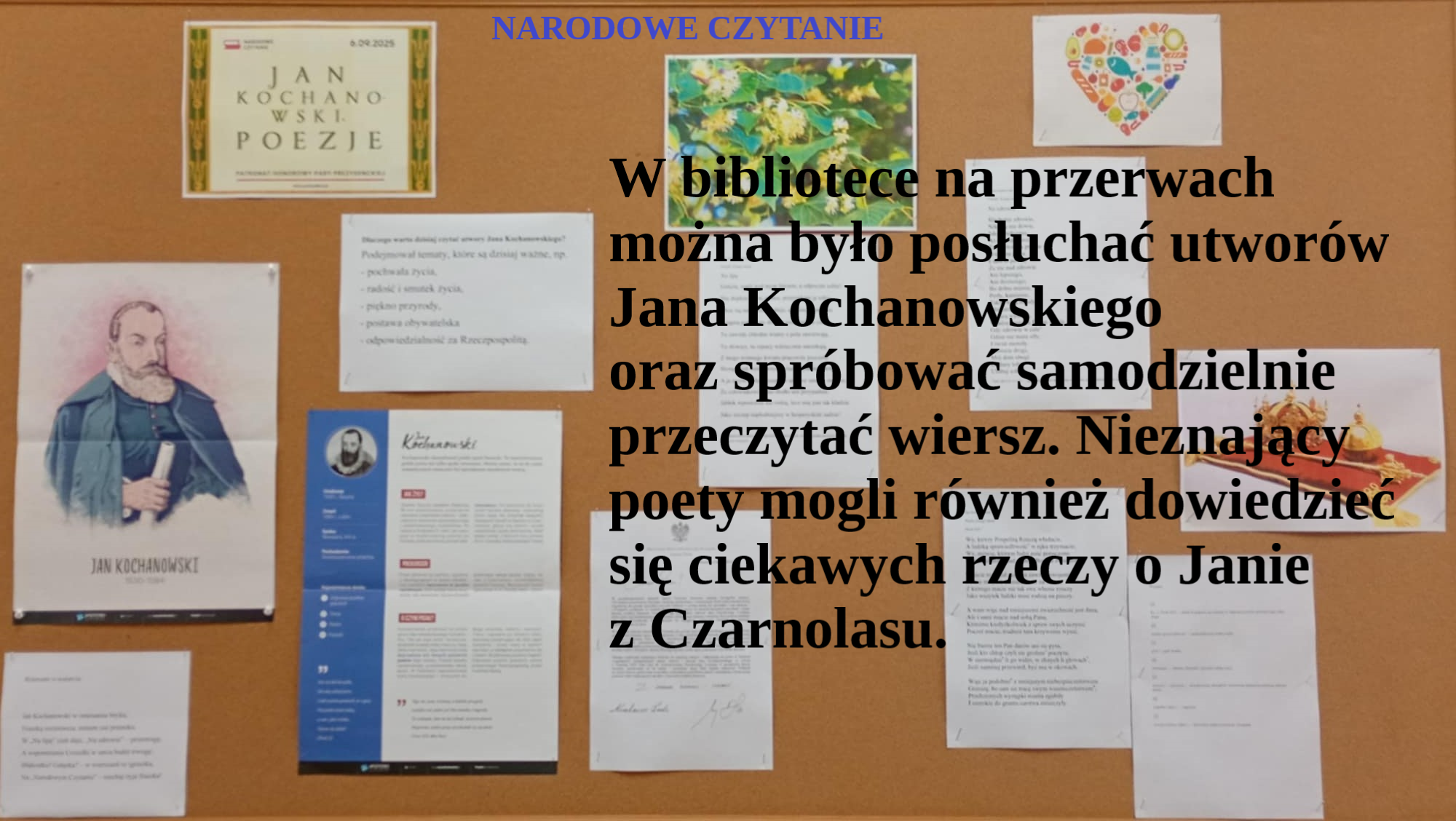 Ogłoszenie wyników zorganizowanego przez bibliotekę szkolnego konkursu "Malowane Poezją" odbyło się 8 grudnia. Wszystkie prace zgłoszone do konkursu spełniły regulaminowe wymogi i pokazały talent interpretacyjny oraz plastyczny uczestników, dlatego jury postanowiło nagrodzić wszystkich uczestników.